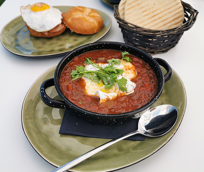 Ich habe mich für das Frühstück „Tel Aviv“ mit Shakshouka (Paradeiser-Paprika Ragout), pochiertem Ei und Fladenbrot entschieden. Meine Begleitung hat die Bacon & Egg Semmel (handgemachte Semmel mit Speck und Spiegelei) und die Pancakes mit Beeren und Nüssen bestellt. Dazu gab es einen Verlängerten, einen Caffé Latte mit Sojamilch und einen hausgemachten Smoothie mit Erdbeeren, Apfel und Minze.