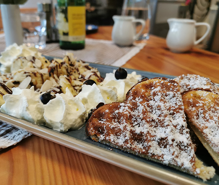 Waffeln kommen süß, zB. als „Freches Früchtchen“ mit Früchten der Saison, hausgemachter Vanillesauce und Schlagobers (€ 8,-) oder pikant, zB. mit Schinken, Käse und Knoblauch-Joghurt Sauce (€ 7,-) auf den Frühstückstisch. Natürlich dürfen auch verschiedene Kuchen, Torten und Strudel nicht fehlen.