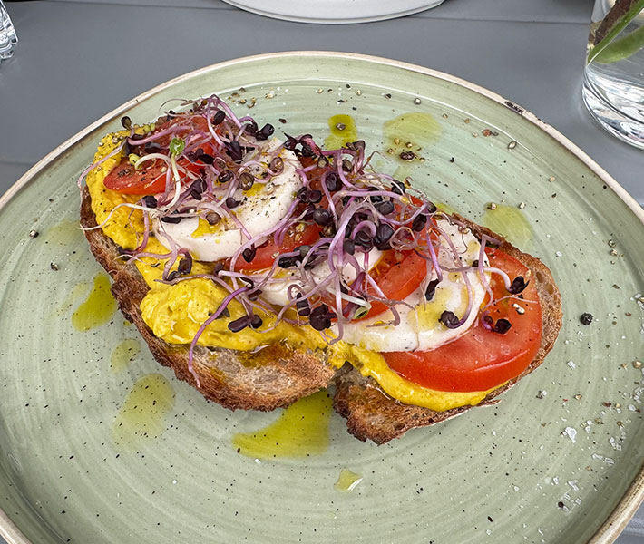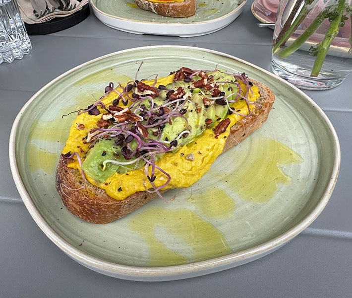 Die Auswahl ist – genau so wie das gesamte Lokal – klein, aber fein. Auf der Frühstückskarte sind ein „Smokey Karotten Sauerteigbrot“ mit selbst eingelegten Karotten, Dille, hausgemachtem Hummus, Rauchsalz und BBQ Rauchöl (€ 12,80), ein „Roastbeet Toast Sandwich“ mit veganem Roastbeet, veganem Käse und Essiggurkerl (€ 10,60), ein „Avo-Sauerteigbrot“ mit Bio-Avocado, hausgemachtem Hummus und Zitronenöl (€ 12,90) und ein „Tomaten Mozzabella Sauerteigbrot“ mit Tomaten, veganem Mozzarella, hausgemachtem Hummus und Pistazienkernöl (€ 12,90) zu finden.