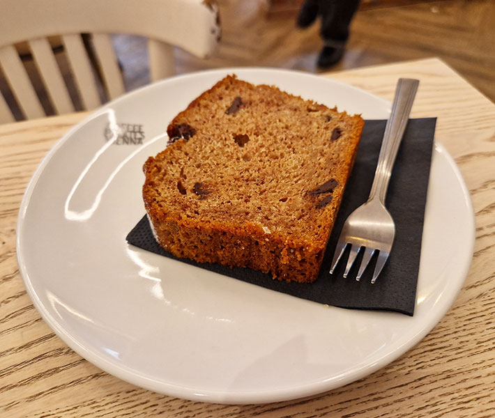 Bei den CoffeePirates muss man an der Theke bestellen und das Essen auch selbst abholen. Die Mitarbeiterin, die meine Bestellung entgegennahm, war recht freundlich. Ich habe mich für ein „Panino Toskana” zum Frühstück entschieden, das erfreulicherweise schön knusprig getoastet wurde. Das versprochene rote Pesto im Panino war zwar eher eine Tomatensauce, hat aber sehr gut geschmeckt. Das Tomaten-Aroma war im Panino dominant, da ich das aber mag, war ich auch mit meiner Wahl zufrieden. Als Nachspeise habe ich ein Stück Bananenbrot bestellt, das leider nur schwach nach Bananen geschmeckt hat. Da es auch nicht besonders süß war, fand ich es leider etwas fad – die vereinzelten dunklen Schokostücke im Teig waren aber sehr gut. Ich habe einen Cappuccino mit Hafermilch getrunken, der mein absolutes Highlight war! Der „Pirates Blend”-Kaffee war wirklich köstlich. Dazu kann man sich vom Wasserhahn auch selber ein Glas Leitungswasser holen. Nach der Mahlzeit wird man gebeten, das leere Geschirr auch selbst wieder zurückzubringen.
