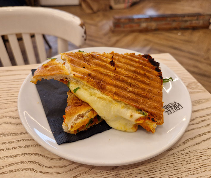 Das herzhafte Angebot besteht aus einer Auswahl an Panini: Ganz italienisch gibt es das „Panino Toskana” mit rotem Pesto, Mozzarella, Tomate und Rucola (€ 5,50) und vom Nahren Osten inspiriert ist das „Panino Naschmarkt” mit Muhammara (einem Walnuss-Paprika-Dip), Falafel und Tomaten (€ 5,50). Für Gemüse-Fans wird das „Panino Veggie Hummus” mit geröstetem Gemüse, rotem Paprika, Karotten, Spinat und Hummus angeboten (€ 5,70), außerdem kann man auch noch ein „Panino Ham & Cheese” mit Spicy Mayo, Schinken, Cheddar und Spinat (€ 5,70) bestellen.