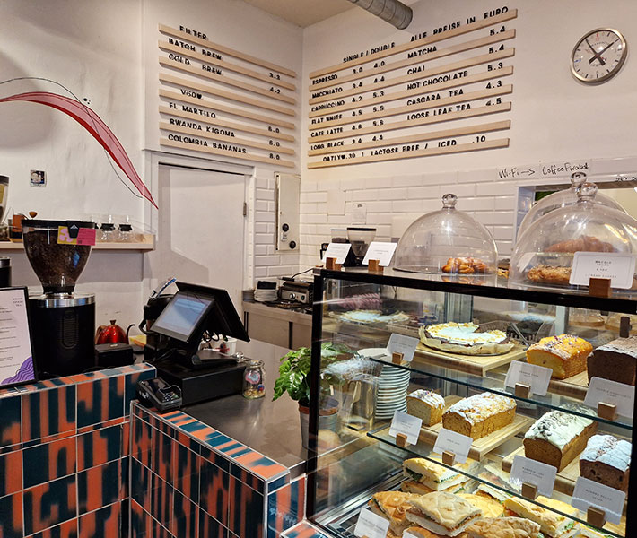 Für den süßen Gusto gibt es zahlreiche Kuchen, etwa „Double Chocolate”-Kuchen (€ 4,30), einen Kürbis-Frischkäse-Kuchen (€ 4,30) und Apfelkuchen (€ 4,30). Als vegane Optionen werden Bananenbrot (€ 4,30), Orangenkuchen und Zitronen-Mohn-Kuchen angeboten. Auch eine glutenfreie Variante gibt es: Honig-Mandel-Torte (€ 4,70).