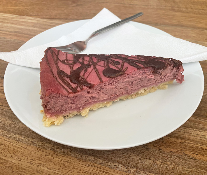 Meine Begleitungen haben sich einerseits für das „Möbel Frühstück“ und andererseits für das Schnittlauchbrot mit Ei und ein Croissant entschieden. Beide haben einen Cappuccino mit Hafermilch getrunken und waren mit den Speisen ebenfalls zufrieden, besonders das Brot ist auch bei ihnen sehr gut angekommen. Zum fruchtigen Abschluss musste es dann noch ein Himbeer-Cheesecake sein, der uns geschmacklich ebenfalls überzeugt hat.