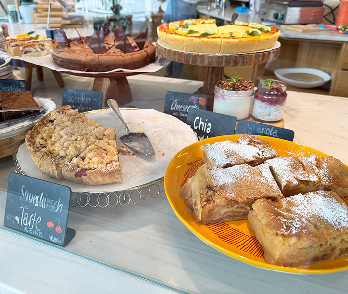 Cremiger Porridge mit homemade Fruchtkompott & Bio-Granola, cremiger Bio-Erdnussbutter & Bio-Dattelsirup (€ 7,50) oder Granola mit Frucht-Kompott auf cremigem Bio-Joghurt – Kuh oder Soja (€ 4,90) bringen fruchtige Frische auf den Frühstückstisch. Diverse Kuchen und Torten und ein Sandwich des Tages in der Vitrine eigenen sich ebenfalls, um am Morgen verspeist zu werden.