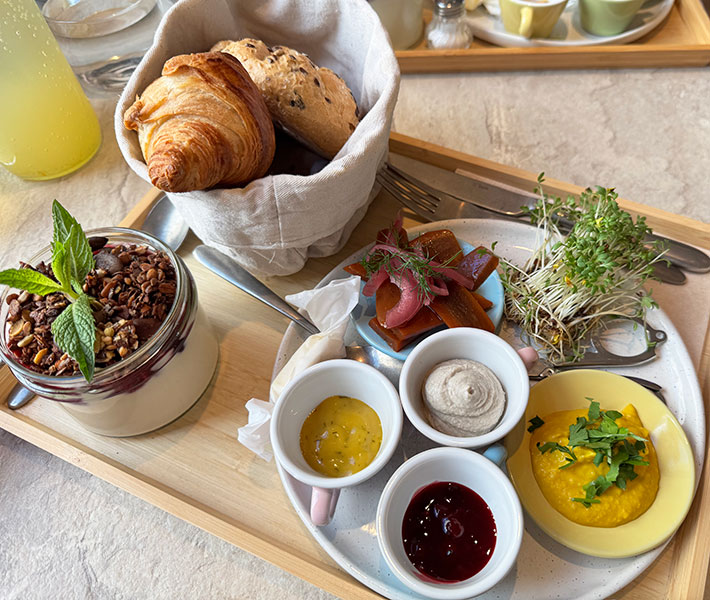 Das Frühstück war nicht nur etwas fürs Auge, alle Komponenten haben auch wirklich gut geschmeckt. Mein Highlight waren das Marillen-Chutney, das Granola und das Croissant – yummy! Ein nettes Detail war auch die Schere, mit der man die Kresse selber schneiden konnte. Nur das Vital-Weckerl war etwas trocken und das weiche Ei war hart gekocht. Das hat meine Begeisterung aber nicht geschmälert, auch der Kaffee war wunderbar und die Limonade dezent aromatisiert und ganz nach meinem Geschmack. Die vegane Variante ist ebenfalls sehr gut angekommen, wir haben beide das erste Mal Carrot Lox probiert – hat uns geschmacklich überzeugt und ist als pflanzliche Fisch-Alternative auf jeden Fall eine gute Option.