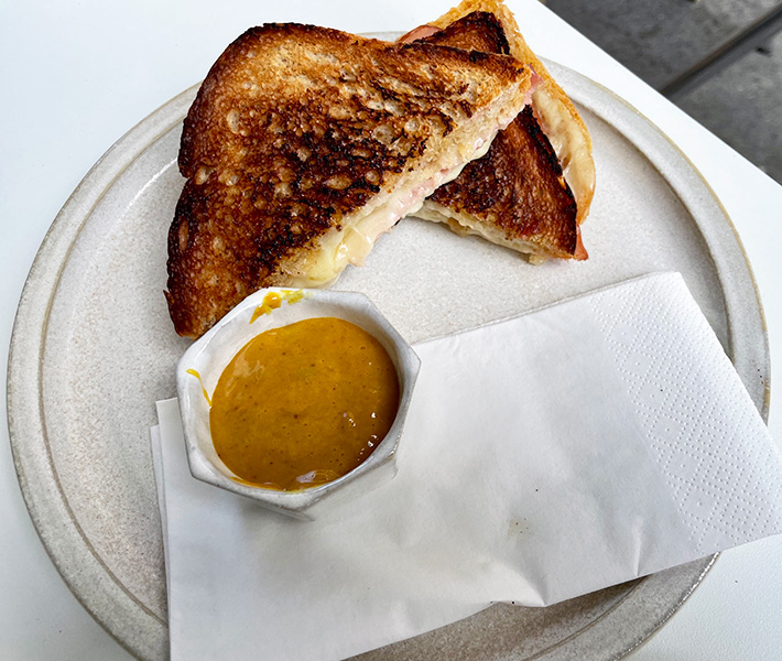 Meine Begleitung hat sich für den Schinken-Käse Toast und einen Cappuccino entschieden. Wir waren hin und weg: der Toast war herrlich kross, sehr buttrig, mit viel geschmolzenem Käse und genau der richtigen Menge an Schinken gefüllt. Auch die Curry-Cocktail Soße, ebenfalls von Markus Mraz gemacht, hat perfekt dazu gepasst.