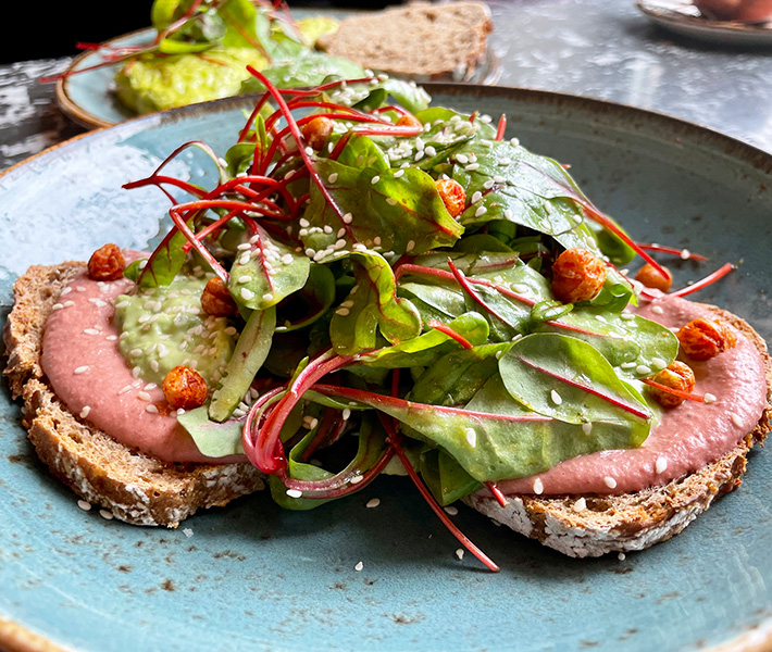 Weiters werden allerlei Sandwiches und Toasts angeboten. Zum Beispiel das „Ramasuri Sandwich“ (€ 12,90) bestehend aus Madame Crousto, Heublumenkäse-Eierspeis aus 2 Eiern, semi-dried Paradeisern, sautiertem rotem Babymangold, kandiertem Bacon und Kürbiskernöl-Mayo, das vegane „Spicy Mango Avocado“ (€ 11,90) mit Madame Crousto, Vanille-Avocado-Mash, rotem Babymangold, Mango-Chili-Chutney, karamellisierten Cashewkernen und Basilikum-Marillen-Dressing, optional mit pochiertem Ei (+ € 1,80) oder das „Vegans don’t bite“ (€ 9,50) mit Rainer Roggen mit Rote-Rüben-Humus, Erbsen-Mash, schwarzem Sesam, crispy Chickpeas und mariniertem Babymangold, mit Aufpreis erweiterbar um ein pochiertes Ei (+ € 1,80) oder Feta (+ € 1,00).
