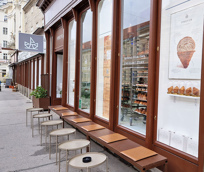 Im Freyja gibt es zum Frühstück qualitativ hochwertige Backwaren und ein kleines Frühstücksangebot, das man im freundlichen Lokal mit hellen Naturfarben oder im Schanigarten verspeisen kann.