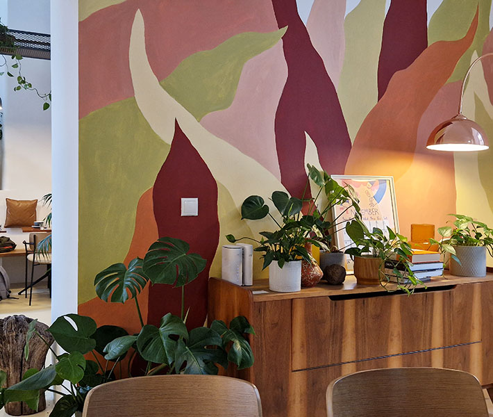 Den Café-Bereich des Freyja zieren einige Pflanzen, eine Wand ist auch mit bunten Pflanzenmotiven geschmückt. Die Tische und Sessel sind in Braun- und Grüntönen gehalten, zusammen mit den übrigen weißen Wänden und viel natürlichem Licht ergibt sich eine belebende Naturatmosphäre.