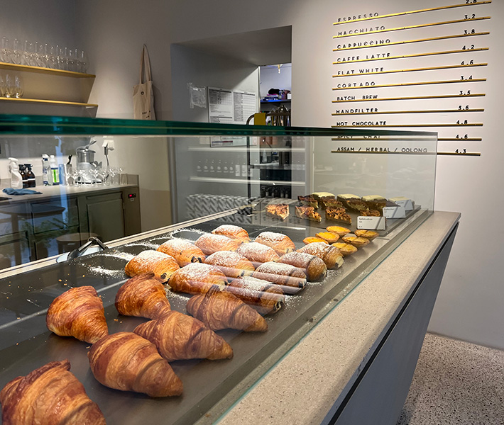 Bis 15.00 Uhr gibt es klassische Süßspeisen wie ein „Homemade Schoko-Nuss Granola“, wahlweise mit Kuh-, Erbsen oder Hafermilch (€ 10,90), „Waffel Brownie-Style“ mit Matcha Schaum und Blaubeeren (€ 11,40), „Vegan Peanut Butter Oatmeal“ mit Bananen, Sauerkirschen, Kakaonibs und Erdnussbutter (€ 9,80) oder Pancakes, wahlweise mit griechischem Joghurt und Ahornsirup und Orangen oder mit Schoko-Kardamom-Sauce und Früchten nach Saison (€ 10,90). Aus der Vitrine kann man sich Croissants, Pain au chocolat, Pastel de nata und täglich frische Backwaren aussuchen.