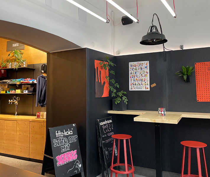 Auf der Karte finden sich die üblichen Verdächtigen wie Espresso, Cappuccino, Flat White und Americano, aber auch heiße Schokolade, Chai Latte und verschiedene Tees. Der Kaffee wird aus der „Gorilla Kitchen Blend“ gebraut und kommt von Alt Wien Kaffee. Gegen Aufpreis kann Kuhmilch auch gegen Sojamilch getauscht werden.