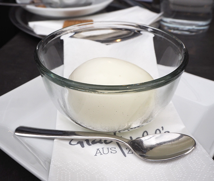 Wir haben uns für das Genießer Frühstück mit Honig statt Schinken und das Freundinnen Frühstück plus Ei im Glas entschieden. Uns hat gut gefallen, dass man sich das inkludierte Gebäck aussuchen kann und dass es dann auch schon aufgeschnitten serviert wurde. Beim Freundinnen-Frühstück hat man auch die Wahl zwischen verschiedenen Aufstrichen, ich habe mich für Basilikum entschieden. Mein Highlight war das Vollkorn-Croissant, das war überraschend schmackhaft. Mein Ei im Glas wurde unbeschadet und perfekt gekocht serviert, das Ei meiner Frühstücksbegleitung hatte weniger Glück – es wurde erst viel später an den Tisch gebracht und war dann auch noch geplatzt. Alle Produkte sind aber sonst von ausgezeichneter Qualität und haben auch gut geschmeckt – etwas mehr Abwechslung würde dem Frühstücksangebot im Gradwohl’s Auszeit aber sicher nicht schaden. Dazu gab es Melange und Kleinen Braunen, auch wieder mehrere Tassen. ;-)