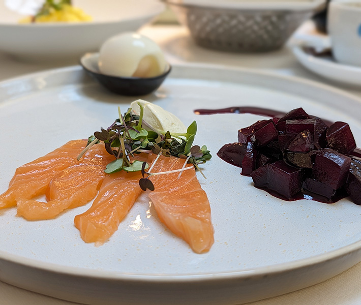 Wir haben uns für die Eierspeise von 3 Eiern mit getrockneten Paradeisern und Grana (€ 8,-) mit Butterbrot mit Kresse (€ 3,40) und das Package „Norwegisch“ mit hausgebeiztem Graved Lachs (Norwegen), Frischkäse, Butter, Brot, hartgekochtem Ei, marinierten rote Rüben und Heidelbeermarmelade (€ 15,-) entschieden, danach haben wir uns noch die Topfen-Pancakes mit Nougat und Haselnüssen (€ 8,-) geteilt. Dazu gab es einen Flat White und einen Verlängerten.