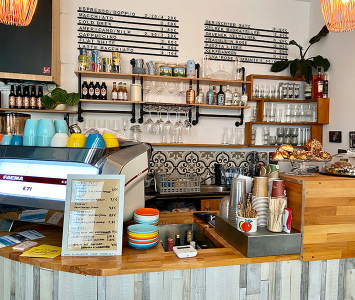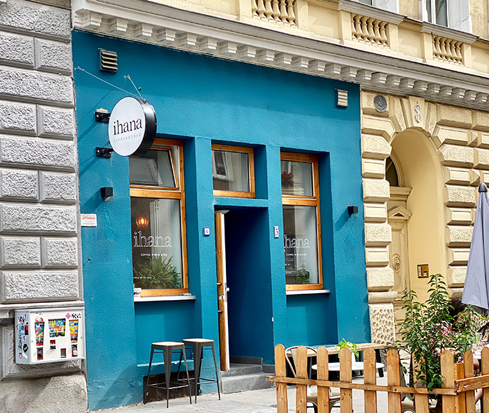 Die Fassade des Café Ihana ist in einem kräftigen Petrol gestrichen, das man schon aus der Ferne leuchten sieht. Im Lokal gibt es zusätzlich zum Schanigarten ein paar Sitzgelegenheiten, finnische Zeitschriften sowie skandinavische Süßigkeiten, die auf der Theke zu bewundern sind. Ebenfalls zu erwähnen: die Preisgestaltung im Café Ihana ist fair – eine Zimtschnecke kommt beispielsweise auf € 2,50, die Brote gibt’s ab € 4,80.