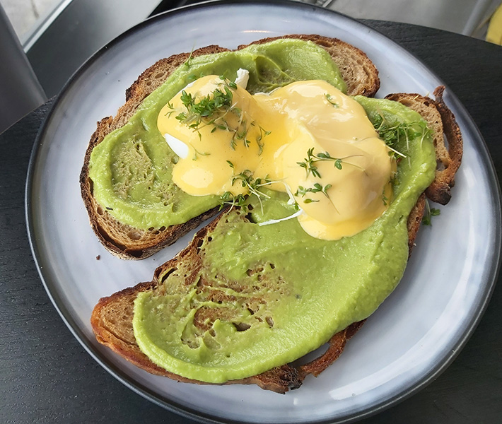 Krustenbrote von der Bäckerei Öfferl werden mit verschiedenen Belägen angeboten, zum Beispiel „Das Grüne“ mit Avocadomash, zwei pochierten Eiern, Kresse und Hollandaise (€ 11,40) oder „Das Vegane“ mit geräuchertem Paprikaaufstrich, Ebly, Oliven, getrockneten Tomaten, Kresse und Gemüse (€ 10,80). „Das Geräucherte“ ist mit Vulcanoschinken belegt, zwei pochierten Eiern, Blattspinat, Kresse und Hollandaise (€ 12,60) und „Das Nordische“ mit Räucherlachs, Kren-Gervaiscreme und Schnittlauch (€ 14,80).