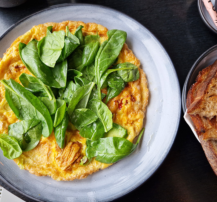 Auch Eiergerichte fehlen nicht auf der Speisekarte. Das „Power Omelette“ besteht aus drei Eiern, Hühnerfleisch, Blattspinat, Avocado, getrockneten Tomaten und Kräutern (€ 10,80). Das vegane „Rührei“ mit Gemüse wird aus Tofu, Kurkuma, Kala Namak und Gemüse der Saison (€ 8,90) zubereitet und das „Spiegelei & Vulcanoschinken“ aus zwei Eiern (€ 8,80). Man kann sich ein Beef Tatar (100g ) im Asia Style mariniertem Bio-Beef schmecken lassen, das mit Wildsalat, Ei, Chili und Olivenstaub garniert wird (€ 14.80), dazu wird geröstetes Krustenbrot gereicht.