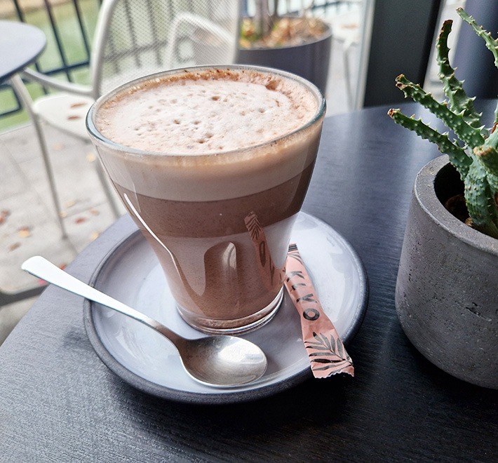 Ich habe mich für das „Power Omelette“, das mit Öfferl Brot serviert wird, entschieden und meine Begleitung für „Das Grüne“. Die Brote waren noch warm, innen weich und außen knusprig – perfekt. Der Avocadoaufstrich hat aber leider etwas zu mild geschmeckt. Mit den pochierten Eiern waren wir zufrieden und auch die Sauce Hollandaise war sehr gut. Das Hühnerfleisch im „Power Omelette“ war würzig und mit dem Blattspinat wurde nicht gegeizt, es war uns aber etwas zu trocken und wir haben nachgesalzen. Gleich zu Beginn wurden uns unaufgefordert zwei Gläser Leitungswasser serviert, zusätzlich haben wir einen Espresso Macchiato mit Hafermilch und eine heiße Schokolade mit laktosefreier Milch bestellt. Der Kaffee war tadellos und auch die heiße Schokolade mit aufgeschäumter Milch ließ keine Wünsche offen.