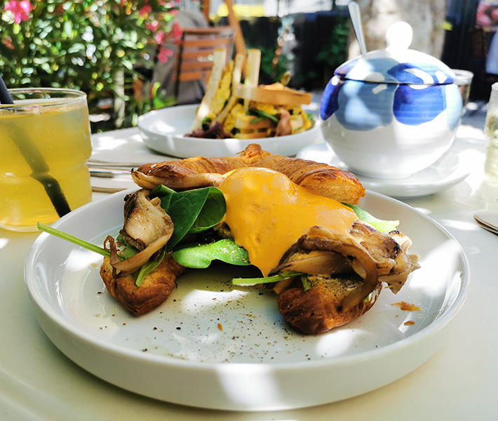 Die nette Dame im Service war sehr freundlich, hat uns gleich eine Karaffe Wasser an den Tisch gebracht und auch alle unsere Fragen gerne beantwortet. Wir haben uns einen kleinen Tisch, eingebettet zwischen grünen Sträuchern und Oleander, ausgesucht und gut behütet von einem großen Schirm unser Frühstück im schönen Garten verspeist. Mit den Lichterketten, frischen Blümchen auf den Tischen, bunten Sesseln und vielen Pflanzen ist das wirklich ein sehr schöner Ort, um entspannt in den Tag zu starten! Aber auch im Lokal – neben der Bar oder im separaten Raum – gibt es einige kleinere Tische mit bunten Stühlen, die ebenfalls zum längeren Bleiben einladen.