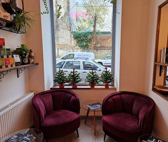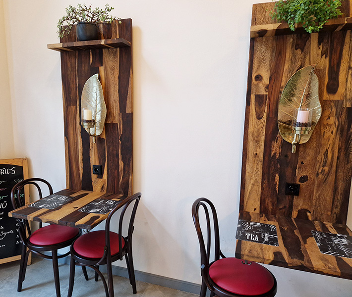 Die Atmosphäre im Sampresso verbreitet gute Laune. Fröhliche Pop-Cover schallen in einer angenehmen Lautstärke durchs Lokal und das pink-weiße Leuchtschild mit dem Schriftzug “Coffee” ist ein netter Blickfang. Innen- und Außenraum sind mit zahlreichen Pflanzen geschmückt. Große goldene Blätter aus Metall fungieren überdies als Kerzenhalter. Zum gemütlichen Verweilen laden zwei rote Polstersessel ein, in denen man auch in den bereitgestellten Büchern schmökern kann. Zum Essen eignen sich die drei Holztische, die auch praktisch zum Arbeiten sind, da sich neben ihnen Steckdosen befinden. Und ist das Wetter schön, kann man auch vor dem Lokal an schwarz-grau gemusterten Tischen auf Kunstrasen Platz nehmen.