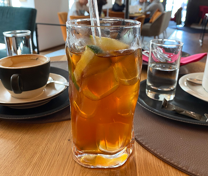 Die riesige Auswahl im Schau.Spiel kann morgens schon eine Herausforderung sein, wir haben auch etwas länger gebraucht, um uns zu entscheiden. Wir haben schlussendlich einmal ein Omelette mit Käse und Gemüse (€ 5,60) sowie ein Naturjoghurt mit frischem Obstsalat und Ahornsirup (€ 4,10) und einmal das „Golden Morning“ mit in Bauernbutter gebratenem Brioche, fein belegt mit geräuchertem Wildlachs, pochiertem Ei und sautiertem Blattspinat, gratiniert mit Sauce Hollandaise und Joghurt mit Früchten sowie einem Glas frisch gepressten Orangensaft plus ein Heißgetränk nach Wahl (€ 12,90) bestellt. Dazu eine Melange plus Limette-Ingwer-Minze Eistee und eine heiße Schokolade mit Schlagobers – wir haben ja schließlich Energie für die Radtour gebraucht. ;-) Der Kaffee und die heiße Schokolade waren wunderbar, der hausgemachte Eistee hingegen war schwierig. Er hat leider extrem künstlich, wenn nicht sogar eigenartig, geschmeckt – ich konnte daher nicht mehr als ein paar Schluck machen und musste den Rest stehen lassen. Das Omelette hat zwar etwas trocken ausgesehen, war es dann glücklicherweise aber nicht. Für meinen Geschmack war es aber viel zu wenig gewürzt, das konnte ich mit dem nachträglich bestellten Salz & Pfeffer aber leicht beheben. Wenn man jetzt besonders kritisch sein möchte, dann hätte man die Zwiebeln vielleicht etwas länger braten können, die waren noch fast roh. Das Joghurt hat mir sehr gut geschmeckt, der Ahornsirup war genau richtig dosiert und der Obstsalat frisch. Eine kleine Portion davon gab es auch zum „Golden Morning“, das zwar mit der dicken Scheibe Brioche, Lachs, pochiertem Ei und Sauce Hollandaise sehr mächtig war, meiner Begleitung aber bestens gemundet hat.