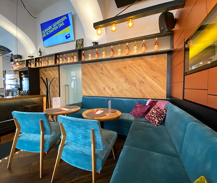 Das Schau.Spiel ist sehr gemütlich eingerichtet, auf den bequemen, bunten Sitzgelegenheiten kann man es schon eine Zeit lang aushalten. Bei schönem Wetter kann man auch im riesigen Gastgarten direkt am Rathausplatz frühstücken, hier findet man eher einen freien Tisch als im Lokal. Bei unserem Besuch während der Woche (!) hatten wir Glück und haben um 10.00 Uhr noch den letzten freien Tisch erwischt! Die MitarbeiterInnen im Service waren sehr freundlich und auch aufmerksam. Wenn man mit Karte bezahlen möchte, muss man allerdings zur Theke kommen, das ist am Tisch nicht möglich.