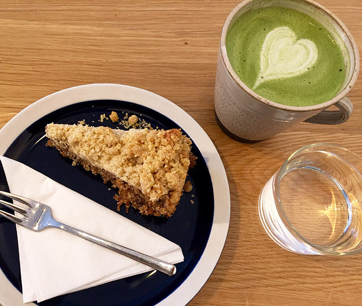 Ich entschied mich für ein Schinken-Sandwich und einen Hafermilch Cappuccino. Die hochwertigen Zutaten schmeckte ich definitiv heraus und der Cappuccino überzeugte mich so sehr, dass ich mich nach der Röstung erkundigte (Süssmund – Finca Vizcaya). Als ich ein wenig später noch einmal Gusto bekam, probierte ich noch ein Stück Karottenkuchen, dazu einen Matcha Latte. Ich habe ja eine Schwäche für Karottenkuchen und schon viele probiert, aber ich muss sagen, der hier hat definitiv Potential für einen neuern Favoriten – ein richtiger „Feel-Good-Kuchen“ mit viel Zimt, saftiger Karotte und knusprigen Streuseln … yummy! Der Matcha Latte wurde in einem der großen handgetöpferten Häferl serviert, war kräftig im Geschmack und schön aufgeschäumt. Neben freiem WLAN und einer Auswahl an Zeitungen und Magazinen werden hier auch Zubehör, Kaffeebohnen, Kakao und Prana Chai für daheim angeboten.