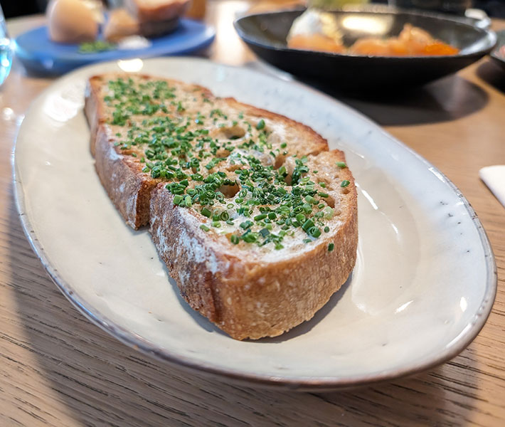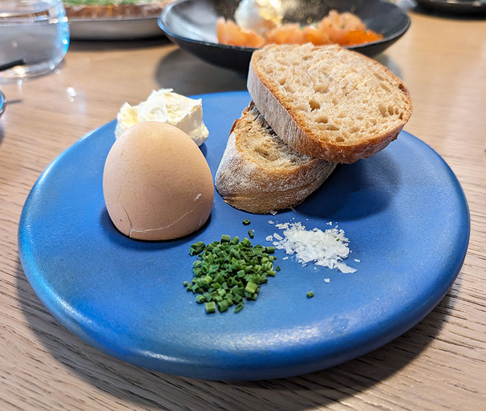 Wir haben beim aktuellen Besuch &floras Pink Eggs mit Pink Labneh, 2 Spiegeleiern, Dukkah und Blüten (€ 14,-) sowie ein weiches Ei mit Öfferl Baguette, Butter, Schnittlauch und Maldonsalz (€ 6,-), Öfferl Sauerteigbrot mit Schnittlauch (€ 6,-) und die gebeizte Lachsforelle mit Butter, Lachsforellenkaviar und Öfferl Baguette (€ 10,-) bestellt. Danach haben wir uns auch noch die Pancakes mit Mascarponecreme und Rhabarber Röster (€ 14,-) geteilt, dazu gab es einen Cappuccino mit Hafermilch und einen Verlängerten sowie die hausgemachte Ingwer-Minze Limonade.