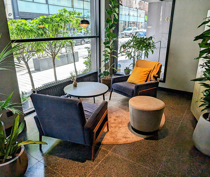 Durch das Glasdach, die vielen grünen Pflanzen, die blauen Fliesen an den Wänden und das leise Geplätscher vom Springbrunnen hat man den Eindruck, man frühstückt in einem stylischen Gewächshaus. Die langgezogene gelbe Sitzbank in der Mitte des Lokales und die bunten Sessel sorgen für fröhliche Farbakzente, für mehr Privatsphäre empfehlen sich die Tische an den Seiten, wo bequeme Ledersofas und dezente Beleuchtung für eine gemütliche Atmosphäre sorgen. Im Sommer gibt es auch einen kleinen Schanigarten.