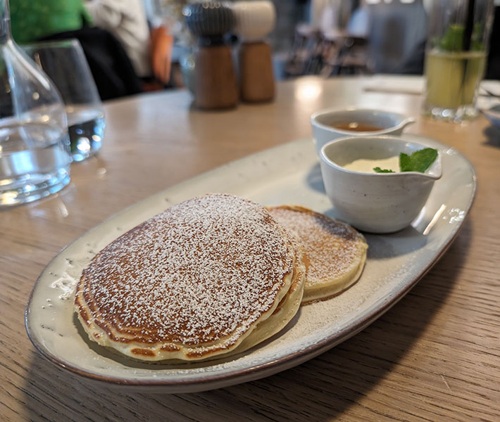 Die Pink Eggs haben mir gut gefallen, allerdings hätte ich mir die Spiegeleier warm gewünscht, die waren leider schon kalt. Alle weiteren Gerichte waren von wirklich ausgezeichneter Qualität und haben auch wunderbar geschmeckt. Das Brot war warm, die Butter aufgeschlagen, das weiche Ei perfekt gekocht – die Lachsforelle samt Kaviar war allerdings für meine Begleitung das Highlight. Die Pancakes waren herrlich fluffig und mit der leicht vanilligen Mascarponecreme und dem im Gegensatz dazu säuerlichen Rhabarber Röster ein perfekter Abschluss. Der Verlängerte ist geschmacklich gut angekommen, er kam aber leider nur mehr warm an den Tisch. Mein Cappuccino mit Hafermilch hatte eine etwas eigenartige Note. Ich habe daher danach noch einen Cappuccino mit Kuhmilch bestellt, um rauszufinden, ob es am Kaffee oder an der Milch lag. Der hat mir dann besser geschmeckt, es lag also wohl an der Hafermilch, die nicht ganz mein Fall war.