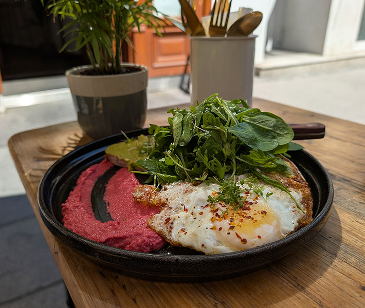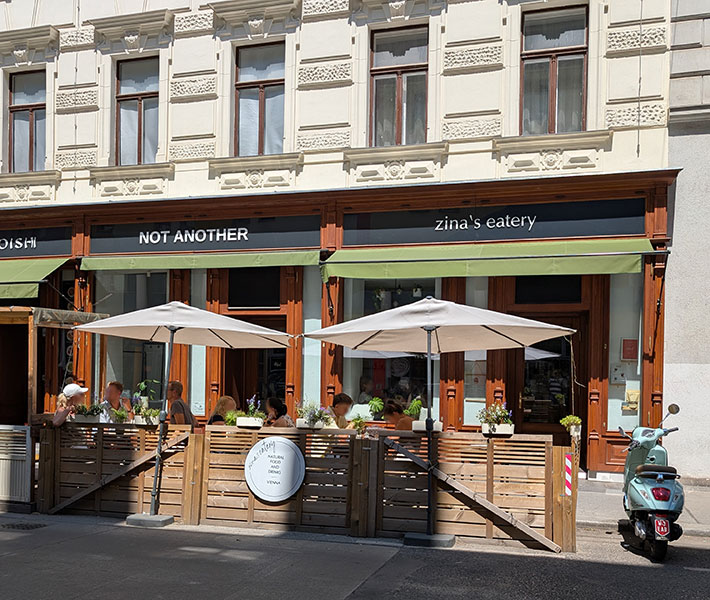 Im Schanigarten mit großen Schirmen hält man es in Zina’s Eatery auch bei warmen Temperaturen gut aus, es stört auch nicht, dass der Garten direkt an der Gumpendorfer Straße liegt. Drinnen im luftig-hellen Innenraum gibt es nur wenige Tische, eine Reservierung schadet daher auf keinen Fall. Nach der Renovierung im letzten Jahr erstrahlt nicht nur die Fassade in neuem Glanz, auch im Lokal herrscht ein sehr freundliches und gemütliches Ambiente, in dem man sich morgens wirklich wohlfühlen kann.