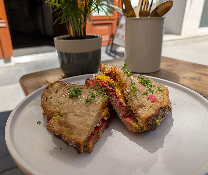 In Zina’s Eatery kann man während der gesamten Öffnungszeiten frühstücken, Mittwoch bis Samstag von 09.00 bis 16.00 Uhr und sonntags bzw. an Feiertagen von 09.00 bis 15.00 Uhr. Brot von der Bäckerei Öfferl gibt es zB. als „The Vegans Choice“ mit hausgemachtem Hummus, Erbsen-Avocadomash, Babyspinat, Karottenstreifen, Gurken und Sprossen (€ 9,50) oder „Avocado Scrambled Tofu Toast“ mit veganem Rührei aus Tofu, Rucola, Babyspinat, hausgemachtem Rote Rüben Hummus, Erbsen-Avocadomash, Chilli und Sprossen (€ 12,90). Hinter „Lachs & Layers“ verbirgt sich ein Croissant mit Cream Cheese, Rucola, geräuchertem Lachs, Gurke, Honig-Senfsauce und Dill (€ 14,50), wahlweise auch mit Rührei oder pochiertem Ei (+ € 2,-).