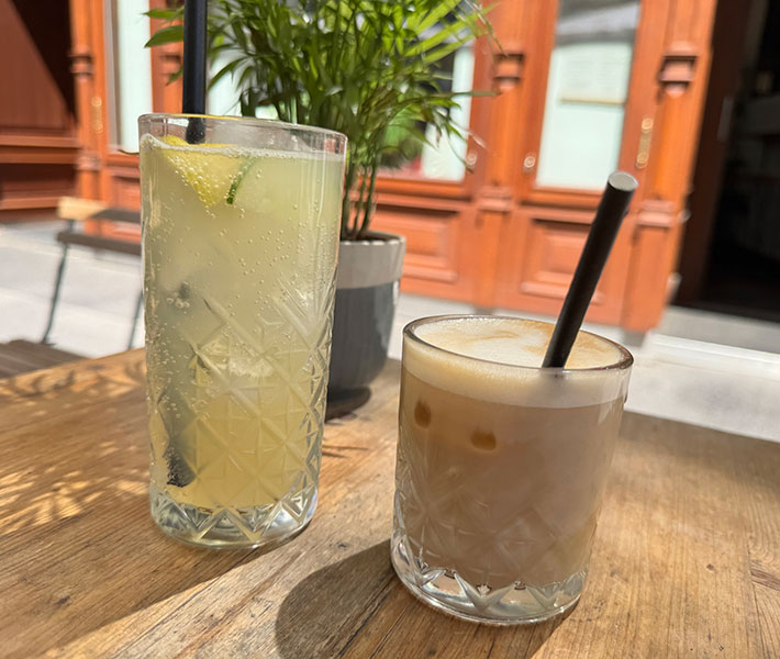 Kaffee von der Rösterei Alt Wien wird neben Kuhmilch auch mit Kokos- oder Hafer- bzw. mit Soja-Milch serviert. Hausgemachte Golden Milk, Matcha Latte und Chai Cinnamon Latte dürfen neben Heißer Schokolade, frischem Ingwertee und Kräutertee auch nicht fehlen. Hausgemachte Limonade und gesunde Säfte, zB. „Healthy Green“ oder „Immunity Boost“ sorgen für einen morgendlichen Vitaminkick. Im Sommer kann man auch Specials, wie zB. Coffee x Coconut Water und Matcha x Sparkling Yuzu genießen.